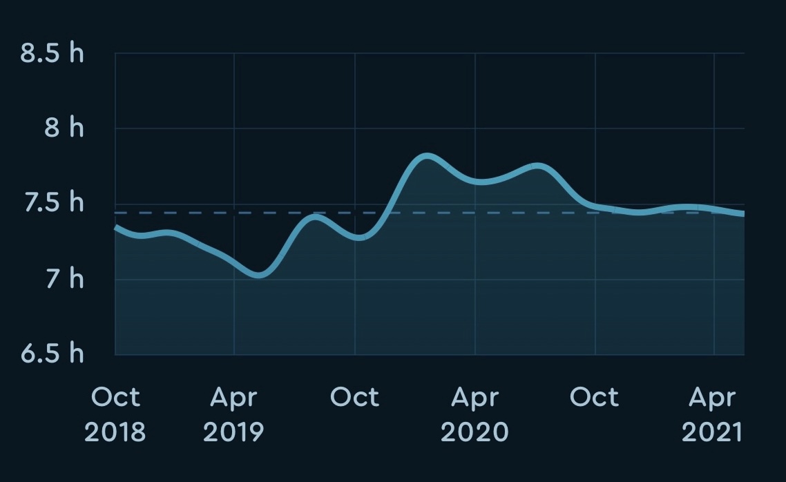 Unen osalta seuraan ainoastaan pitkän ajan trendejä, esim. sitä alkaako unessaoloaikani vaivihkaa lyhentyä, jolloin minun on syytä puuttua asiaan. Kesäkuussa 2019 oli aallonpohja, josta seurasi kaikenlaisia ongelmia, joten yritän välttää samankaltaiseen tilanteen ajautumista. Kun nyt katson pitkän ajan dataa, huomaan, että viime ulkokaudella nukuin selvästi enemmän. Ulkokausi 2020 oli todella hyvä. En ole edes tajunnut, että ero nykyiseen on näinkin suuri. Eipä siis ole mikään ihme, että olo on ollut nyt keväällä vähän tukkoinen eikä kiipeily ole aina kulkenut ihan optimaalisesti. On korkea aika kiinnittää uneen taas huomiota.